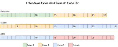 2.2.1. Sobre o ciclo de duração das caixas: As caixas são mensais e o ciclo delas vai do dia 15 do mês até o dia 14 do mês seguinte, repetindo por pelos meses subsequentes. O ASSOCIADO receberá a caixa referente ao ciclo em que aderiu ao clube de assinaturas e os subsequentes até que cancele seu plano. Abaixo segue um diagrama que demonstra os ciclos: